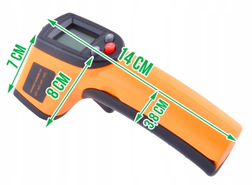 Bezkontaktowy termometr laserowy pozwala na precyzyjne zmierzenie temperatury w zakresie -50°C do +380°C. Pirometr przeznaczony jest do szybkiego, bezpiecznego i dokładnego pomiaru temperatury przedmiotów. Szczególnie przyda się przy pomiarze rzeczy niebezpiecznych (np. bardzo gorących, zimnych), poruszających się lub trudno dostępnych. Pirometr znajduje szerokie zastosowanie w przemyśle motoryzacyjnym, maszynowym, w branży budowlanej, chłodnictwie, gastronomii, przemyśle spożywczym. Urządzenie jest bardzo łatwe w obsłudze - w celu dokonania pomiaru wystarczy wycelować wskaźnik laserowy w badany obiekt i nacisnąć spust. Cały pomiar trawa pół sekundy lub do momentu zwolnienia spustu, wynik wyświetla się na czytelnym podświetlanym wyświetlaczu LCD. Przy wciśniętym spuście możliwy jest pomiar ciągły.