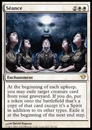 At the beginning of each upkeep, you may exile target creature card from your graveyard. If you do, put a token onto the battlefield that's a copy of that card except it's a Spirit in addition to its other types. Exile it at the beginning of the next end step.