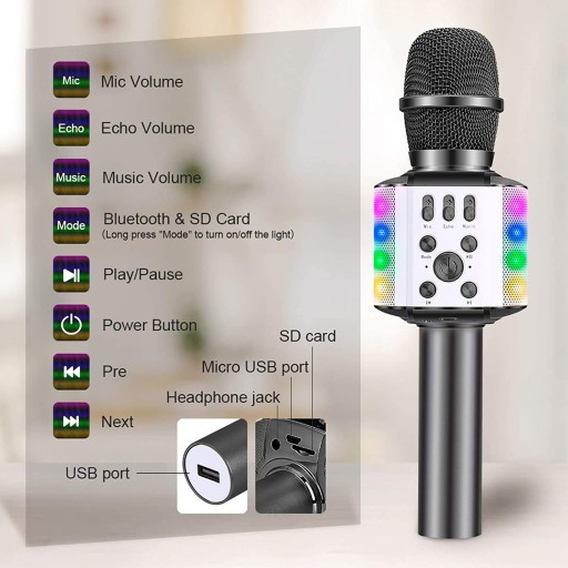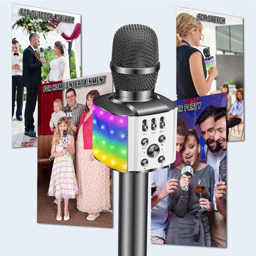 - 【Maszyna do karaoke 4 w 1】 – bezprzewodowy mikrofon Bonaok jest sparowany przez Bluetooth z systemem Android, iPhone, PC i może być używany jako mikrofon karaoke, songrecorder i głośnik Bluetooth. Dodanie pięknych świateł do maszyny sprawia wiele radości.