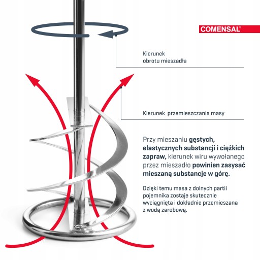 - Przeznaczenie: Masywne mieszadło spiralne marki COMENSAL do ciężkich zapraw budowlanych.