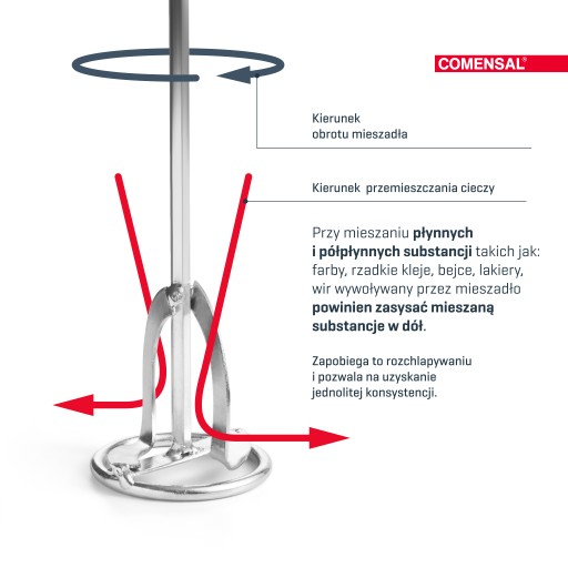 - Rekomendowany kierunek przemieszczania wirowania cieczy: Z góry ku dołowi, dzięki czemu farba się nie rozchlapuje, a mieszadło jest w stanie poruszyć całą zawartość średniej wielkości pojemnika, w którym odbywa się proces mieszania.