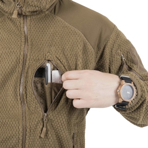 Alpha Hoodie to lekka bluza polarowa, która idealnie sprawdzi się zarówno jako warstwa docieplająca, jak i główna. Bluza ma wzmocnienia na ramionach i łokciach zapobiegające nadmiernemu przecieraniu się elementów polarowych, a także pięć zewnętrznych kieszeni zapinanych na zamki błyskawiczne: dwie na ramionach, dwie biodrowe oraz jedną na wysokości klatki piersiowej. W kieszeni piersiowej znajduje się dodatkowo otwór umożliwiający wyprowadzenie przewodów. Ściągacz u dołu i elastyczne lamówki, którymi obszyte są mankiety oraz kaptur, sprawiają, że bluza przylega do ciała, doskonale chroniąc przed chłodem.
