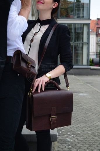 Torba posiada jedną dużą i obszerną przegrodę, w której można zmieścić spory bagaż lub dużą ilość dokumentów w formacie A4. Na tylnej wewnętrznej ścianie torby znajduje się naszyta duża wisząca kieszeń, wykonana z silnego płótna, wzmocniona cienką skórą, zamykana na zamek błyskawiczny. Na dużej kieszeni są jeszcze naszyte dwie mniejsze, otwarte kieszenie, również wykończone cienką skórą. Przód torby jest zapinany paskiem na szerokiej klamrze. Jest to bardzo niezawodne zapięcie chroniące zawartość torby przed niepostrzeżoną kradzieżą. Torba zwieńczona jest solidną skórzaną rączką, dającą pewny chwyt nawet dość mocno obciążonej torby. Całość zawieszona jest na pasku nośnym, który dobrze amortyzuje ciężar torby. Pasek zakończony jest dwoma karabińczykami pozwalającymi na jego odpięcie. Klamra paska jest podszyta skórzaną podkładką, która nie pozwala na uwieranie jej w ramię.
