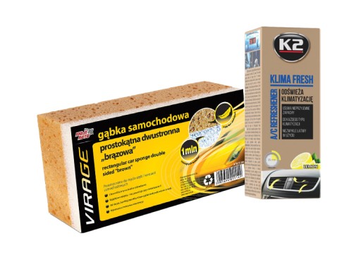 - MOJE AUTO VIRAGE - gąbka dwustronna do mycia karoserii, ciemniejsza miękka strona do karoserii, jaśniejsza bardziej szorstka do usuwania cięższych zabrudzeń.