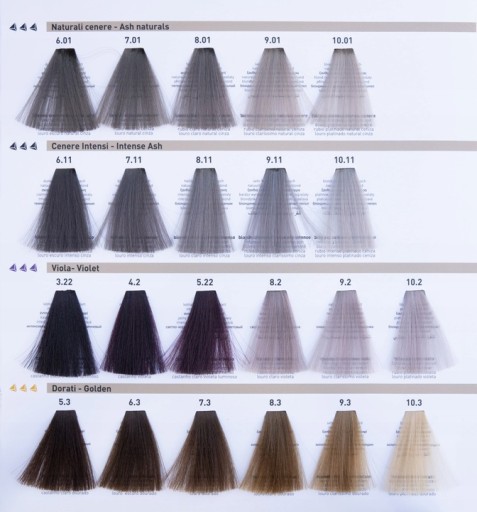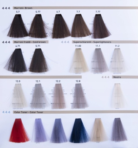 Trwała koloryzacja: Pokrycie do 100% siwych wł., Proporcja : 1:1,5, aktywator : 10-20-30-40 Vol, czas : od 30 do 40 minut, poziom rozjaśnienia : 1-3.