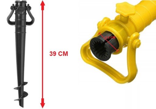 Kotwa mocująca w kształcie świdra pozwala na łatwe i szybkie zamocowanie w ziemi lub piasku parasola ogrodowego, suszarki na pranie, wsporników namiotu itp.