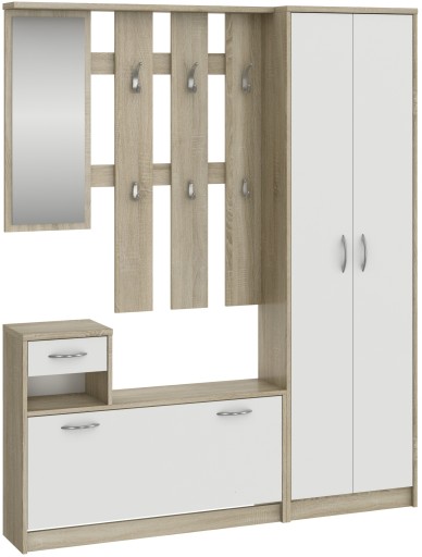 Zestaw do przedpokoju szafa, wieszak z lustrem oraz szafka na obuwie.