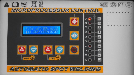 - Wyświetlacz monochromatyczny (wyświetla tryb pracy, czas zgrzewania, grubość materiału i natężenie prądu zgrzewania)