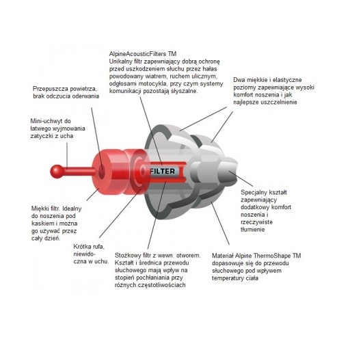 Zatyczki ALPINE mają bardzo miękkie filtry i unikalny kształt. Trwały i elastyczny materiał AlpineThermoShape™ zapewnia najwyższy komfort noszenia. Dzięki ciepłu ucha materiał dopasowuje się do kanału słuchowego, co w połaczeniu z miękkim filtrem zapewnia wygodę noszenia pod kaskiem.