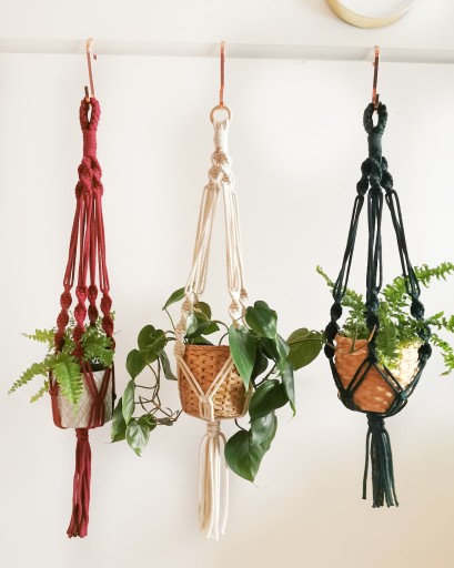 - Każdy kwietnik zawieszony jest na wzmocnionym uchwycie wykonanym ze sznurka lub drewnianym ringu.