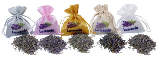 Woreczki zawierają suszoną lawendę: kwiaty, łodygi i liście. Łodygi i liście zawierają najwięcej olejków eterycznych i dlatego nasze woreczki lawendowe długą oddają piękny zapach lawendy.