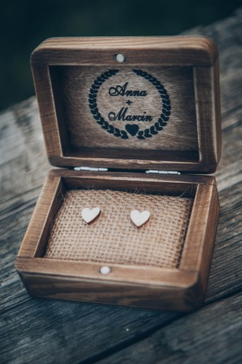 Zamieszczone w środku dwa drewniane serduszka posłużą za uchwyt na obrączki.
