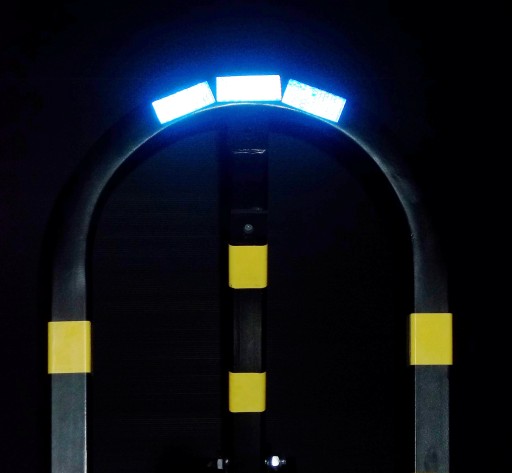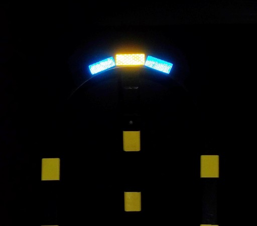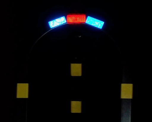 Ten warunkowy odruch wykorzystano stosując nietypowy wzór odblasków w kolorze czerwonym i niebieskim . Wysoko położone intensywne odblaski powodują automatyczne skupienie uwagi na blokadzie .