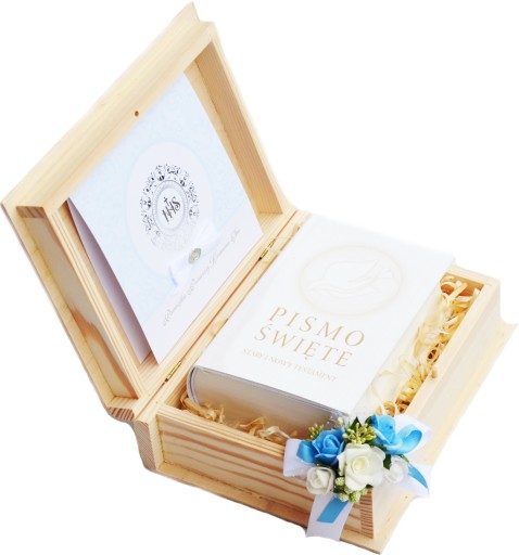 Dekoracja w kolorystyce delikatnego błękitu z białymi i zielonymi dodatkami. W zestawie błękitna Pamiątka Pierwszej Komunii Świętej, która dopełnia piękny wygląd szkatułki, która może posłużyć, jako schowek na biblię, książeczkę świętą, różaniec.