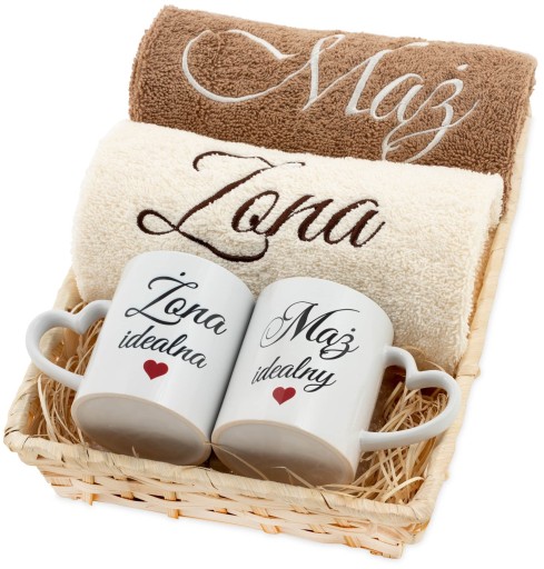 Zestaw składa się z kompletu ręczników "Żona" i "Mąż" 50x100cm oraz dwóch kubków z nadrukiem do wyboru, które posiadają uchwyty klasyczne.