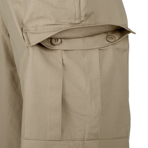 Spodenki Helikon BDU (Battle Dress Uniform) to letnia wersja spodni munduru amerykańskiego BDU, wykorzystywanego przez US Army w latach 1981-2005. Charakteryzują się klasycznym, bardzo wygodnym krojem. Posiadają sześć kieszeni zapinanych na guziki: dwie na biodrach, dwie na pośladkach, oraz dwie pojemne kieszenie cargo, Spodenki zapinane na guziki. Dodatkowo na pośladkach posiadają wzmocnienia z dodatkowej warstwy materiału. Spodenki te, to idealna propozycja dla wszystkich miłośników militarnego stylu. Wykonane zostały z Rip-Stop - lekkiego, odpornego na uszkodzenia mechaniczne i szybko schnącego materiału.