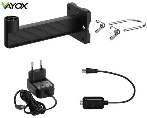 ZESTAW ZAWIERA: Antena Digital360LITE, Zasilacz antenowy 12V, Adapter zasilacza, Wzmacniacz (wbudowany w antenę), Cybant montażowy, Uchwyt ścienny, Gumowa osłona wtyku, Instrukcje montażu anteny
