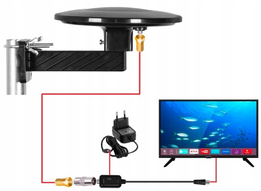 Antena jest gotowa do podłączenia, bez użycia dodatkowych narzędzi i zakładania wtyków na kabel. Wystarczy podłączyć gotowe przewody znajdujące się w zestawie z anteną aby cieszyć się krystalicznie czystym odbiorem ulubionych kanałów!