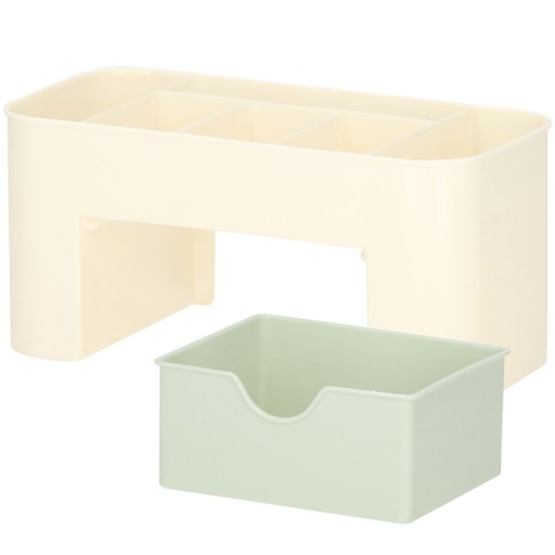 Organizer ma aż 6 przegródek różnej wielkości. Mniejsze mogą z powodzeniem służyć przechowywaniu najdrobniejszych przedmiotów, takich jak kolczyki, pierścionki, lakiery do paznokci czy spinacze biurowe. Większe boczne, z łatwością pomieszczą pędzle, perfumy, czy długopisy.