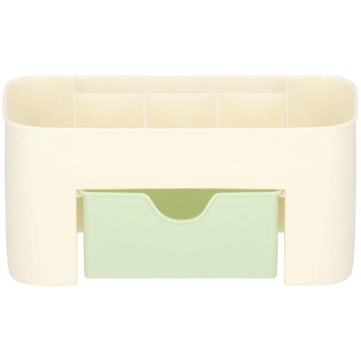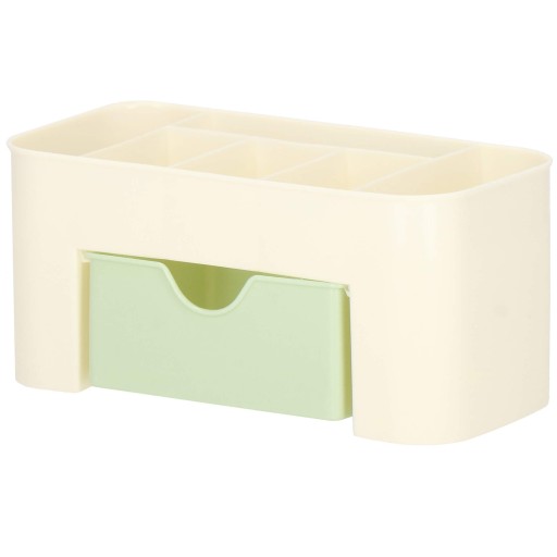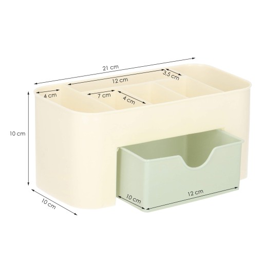 Organizer ma aż 6 przegródek różnej wielkości. Mniejsze mogą z powodzeniem służyć przechowywaniu najdrobniejszych przedmiotów, takich jak kolczyki, pierścionki, lakiery do paznokci czy spinacze biurowe. Większe boczne, z łatwością pomieszczą pędzle, perfumy, czy długopisy.