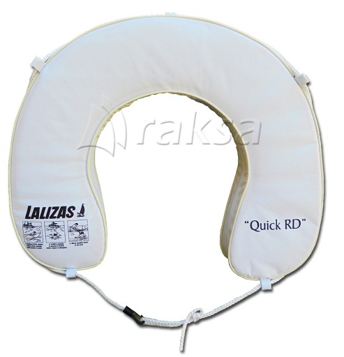 Podkowa ratunkowa "QUICK RD" 145N. Zewnętrzna część (pokrowiec) wykonany z poliestru, wewnątrz znajduje się pianka o dużej wyporności. Kształt podkowy umożliwia każdemu bezpieczne, szybkie i wygodne skorzystanie z niej w przypadku konieczności użycia. Jasny kolor gwarantuje dobrą widoczność w każdych warunkach. Materiał i napisy na podkowie nie blakną, są odporne na promienie UV.