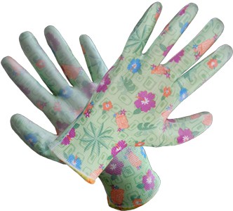 Rękawice z tkaniny elastycznej w artystyczne motywy kwiatowe w kilku wiosennych kolorach. Od strony chwytnej oblewane bezbarwnym poliuretanem.