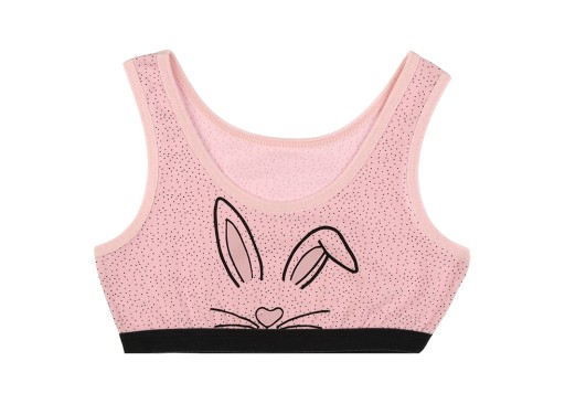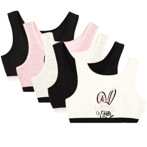 Śliczny zestaw 5 sztuk biustonoszy dziecięcych z nadrukowanym słodkim królikiem. W zestawie staniczki w pięciu kolorach. Oferowane produkty przez LILLY BLING są świetnej jakości, elastyczna, niecisnąca gumka to idealna propozycja na zajęcia sportowe jak również na co dzień.