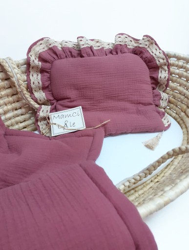 Zestaw składa się z kołderki z wszytym antyalergicznym wypełnieniem, oraz podusi z piękną koronką. Całość wykonana z najwyższej jakości podwójnej bawełny muślinowej, która dzięki miękkiej i miłej w dotyku gramaturze idealnie nadaje się do wózeczków, kołysek, łóżeczek niemowląt.