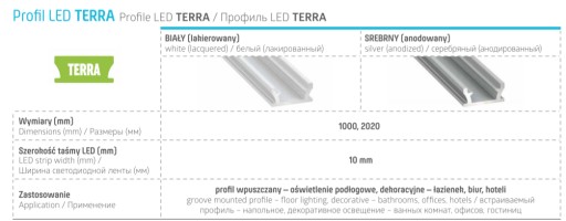 Profil TERRA dzięki wodoszczelności idealnie nadaje się do zastosowań w łazienkach lub tam gdzie potrzebujmy zabezpieczyć taśmę przed wilgocią. Można stosować go w kabinach prysznicowych, jako oświetlenie podłogowe lub sufitowe, w pułkach, gzymsach łazienkowych jak i do podświetlania lustra. Profil ten nadaje się również do zastosowania na zewnątrz do podjazdów, podsufitki dachowej, schodów zewnętrznych, tarasów. Dzięki uszczelniającemu kloszowi, zapobiegającemu zawilgoceniu taśmy LED.