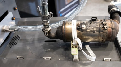 Po pierwszym etapie(w trakcie którego filtr jest zanurzony w DPF Power Cleaner) filtr DPF jest podłączony do uniwersalnego adaptera i uszczelniony. Po starannym przymocowaniu do stołu roboczego wysokie ciśnienie miesza się z powietrzem i wodą oraz w strumieniach przechodzi przez filtr. Pozostałości składające się z sadzy, osadu, środka czyszczącego i wody przepływają przez maszynę i wychodzą przez otwór odpływowy w celu łatwej utylizacji.