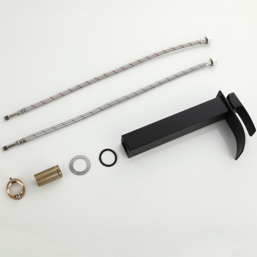 ✔ mechaniczna bateria umywalkowa, stojąca, jednouchwytowa ze stałą wylewką z efektem wodospadu i ceramiczną wymienną głowicą 25 mm, wraz z 2 wysokiej jakości wężykami w oplocie ze stali nierdzewnej o długości 50 cm ze standardowym przyłączem 3/8 cali,