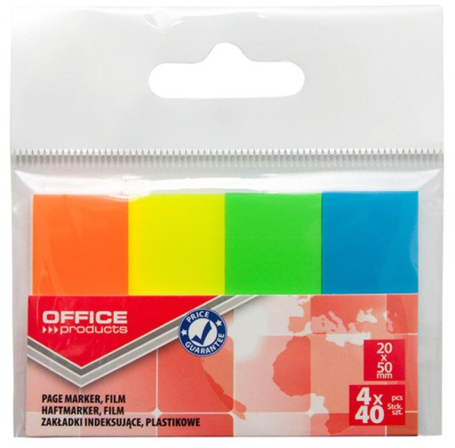 ZAKŁADKI INDEKSUJĄCE OFFICE PRODUCTS, PP, 20X50MM, 4X40 KART., ZAWIESZKA, MIX KOLORÓW NEON