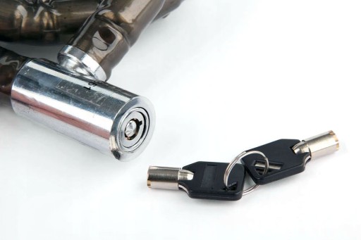 Zapięcie motocyklowe typu linka zbrojona z zamkiem na klucz płaski. W tego typu zapięciach linka stalowa jest poprowadzona wewnątrz stalowych pierścieni, które utrudniają przecięcie zapięcia. Dodatkowa warstwa zewnętrzna z tworzyw sztucznych chroni przed zarysowaniami.