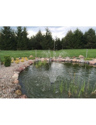 Regulacja pozioma - bardzo mało zestawów dostępnych na rynku posiada taką regulację. Ta innowacja polega na możliwości przesuwania zestawu względem osi o kąt nawet 30 stopni. Jest to niezbędne gdy dno stawu jest nierówne lub naturalnie opada, pogłębia się oczko wodne. Gdy postawimy zestaw fontannowy bez takiej regulacji na krzywym dnie, wtedy woda fontanny nie będzie pryskała równo. W naszym zestawie ten problem jest wyeliminowany poprzez regulację poziomą . Lub jeśli np. pompa po jakimś czasie samoczynnie się przestawi i nie będzie stała równo, dzięki tej regulacji, wystarczy że chwycimy za końcówkę fontanny i wyregulujemy ją tak by woda pryskała równo do góry.