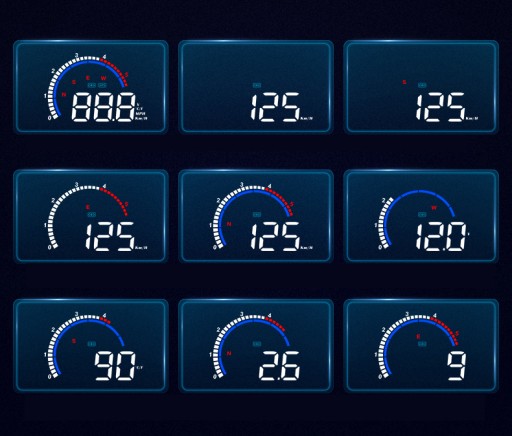 - Prędkość + kompas + graficzne wyświetlenie obrotów + dekoracyjne ikony