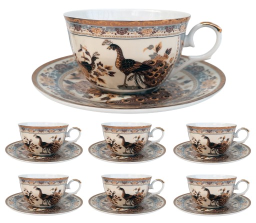 Komplet 6 filiżanek ze spodkami z ilustracją Brązowych Pawi.