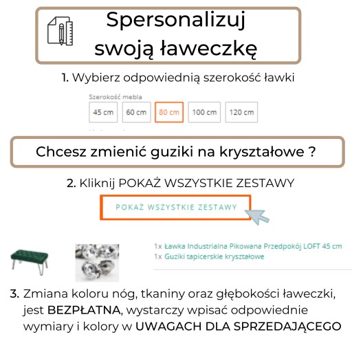 3. Jeżeli chcesz aby guziki w Twojej ławeczce były kryształowe dodaj guziki do zestawu przy zakupie