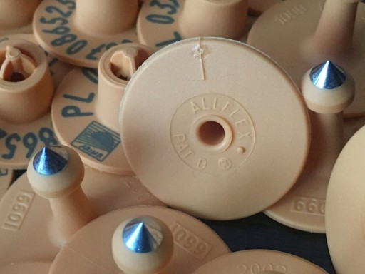 Komplet 100 szt. urzędowych kolczyków trzodowych z metalową końcówką, zgodnym z wzorem ARiMR, z nadrukowanym numerem gospodarstwa - siedziby stada - prosimy o podanie numeru w wiadomości dla sprzedającego!!!, z METALOWĄ końcówką. Do kompletu dołączona jest kolczykownica.