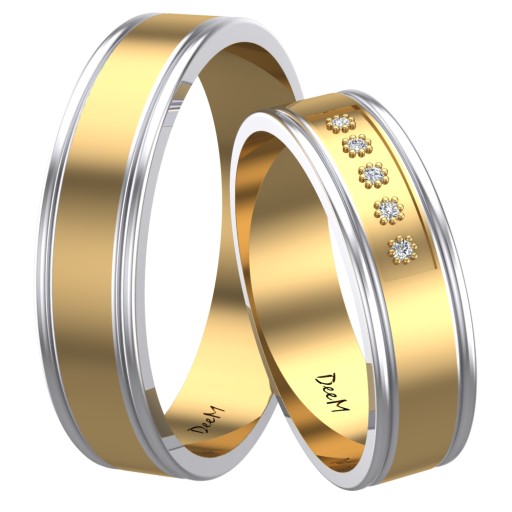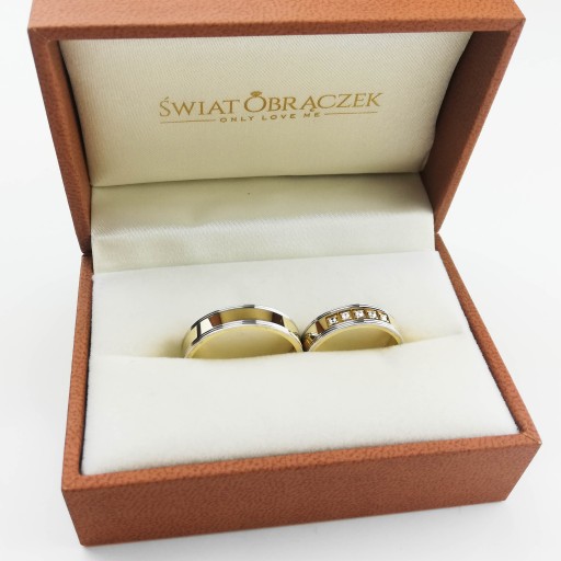 Obrączki wykonane są z najwyższej próby srebra 925, które pokryte zostało 23 karatowym złotem, dzięki czemu do złudzenia przypominają obrączki wykonane w całości ze złota. Powłoka złocenia wynosi aż 2 mikrony i dodatkowo została zabezpieczona bezbarwną warstwą ochronną. Taka metoda wykonania zapewnia wysoką trwałość. Obrączki zostały ozdobione wąskimi paskami pokrytymi białym rodem. Oddzielone są one nacięciami wykonanymi frezem diamentowym, dzięki czemu delikatne wgłębienia przepięknie odbijają światło. Dopełnieniem obrączki damskiej jest 5 zakutych w niej cyrkonii, które można wymienić na szlachetne brylanty. Chcemy, aby nasze obrączki były tak blisko ideału, jak to tylko możliwe - dlatego łączą w sobie atrakcyjną cenę i wysoką jakość wykonania.
