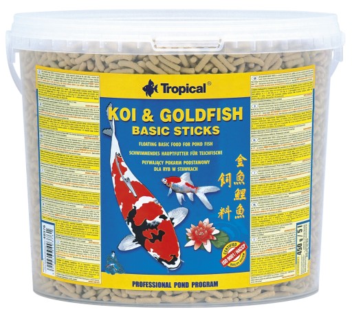 Koi & Goldfish Basic Sticks to wieloskładnikowy pokarm w postaci pływających pałeczek przeznaczony do codziennego karmienia karpi koi, złotych rybek oraz innych ozdobnych ryb karpiowatych, zamieszkujących ogrodowe oczka wodne. Struktura pałeczek powoduje, że pokarm utrzymuje się długo na powierzchni wody. Ułatwia to obserwację żerujących ryb i pozwala kontrolować ilość przyjmowanego przez nie pokarmu. Nadmiar pałeczek można łatwo usunąć z oczka wodnego przy pomocy siatki do ryb. Odpowiednio zbilansowana receptura, zawierająca składniki odżywcze pochodzenia roślinnego i zwierzęcego oraz zestaw witamin i mikroelementów, zapewnia rybom doskonałą kondycję i zdrowie. Pokarm w pełni zaspokaja potrzeby żywieniowe ryb, wzmacniając jednocześnie ich czerwone i złote wybarwienie. Koi & Goldfish Basic Sticks zjadany jest chętnie również przez niektóre płazy i raki zamieszkujące oczko wodne. Ryby regularnie karmione pokarmem Koi & Goldfish Basic Sticks są zdrowe, pełne życia i pięknie wybarwione.