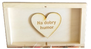 Wewnątrz pudełka znajduje się drewniane serduszko z Twoim tekstem: "Na dobry humor", "Smacznego", "Uśmiechnij się", "Kocham Cię:)" lub podaj nam tekst.