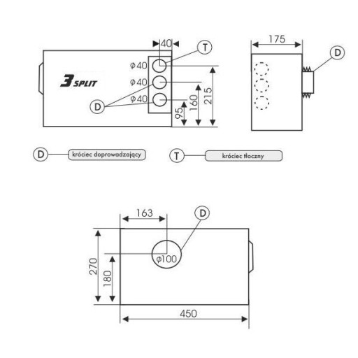 Średnica króćców doprowadzających: 1 x 100mm do WC, 1 x 32/40mm na górze do umywalki, zlewu, zmywarki, pralki, 1 x 32/40mm do wanny,natrysku, bidetu