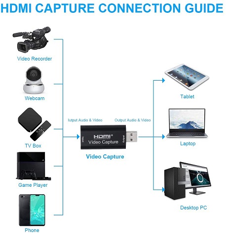 Karta przechwytująca wideo HDMI: obsługuje maksymalną rozdzielczość wejściową 4K 30 Hz, maksymalną rozdzielczość wyjściową 1080 P 30 Hz. Obsługuje również 60 klatek na sekundę w rozdzielczości 720p Zgodność ze standardem USB Video i UVC; Standard USB Audio UAC