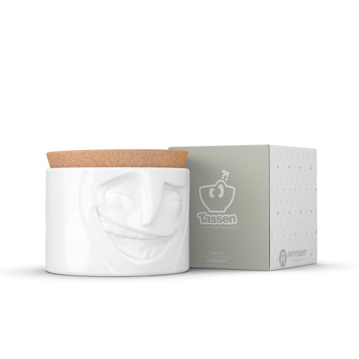 Niezwykłay, zaskakujący designem rodem z animacji 3D, ręcznie wykonany z najwyższej jakości porcelany słoik z pokrywką z korka WESOŁA BUŹKA kreatywnej marki 58Products. Słoik posiada szczelną pokrywkę, dzięki czemu umożliwia przechowywanie nie tylko cukierków i cukru lecz kawę, herbatę i inne przyprawy. Wszystkie przyprawy pozostają świeże w słoiku z WESOŁYM uśmiechem. Ozdobna pokrywka z korka umożliwia ustawianie jednego słoika na drugim. Słoik bez pokrywki doskonale pomieści sztućce czy serwetki.