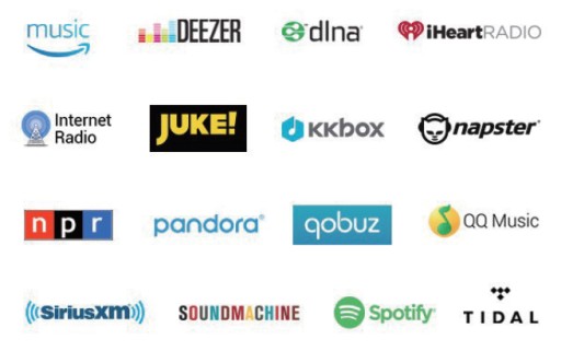 - Wsparcie dla Amazon Music, Spotify, TIDAL, KKBox, SiriusXM, Napster, Internet Radio, Deezer, iHeartRadio, Pandora, SoundMachine, Qobuz, QQmusic
