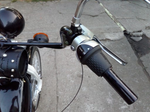 Rower wyposażony w instalację elektr. 6V z akumulatorem żelowym ładowanym z ładowarki, żarówkami LED (światła, kierunkowskazy) oraz elektryczny sygnał dźwiękowy, napęd Shimano Nexus Inter7 (przerzutki w piaście praktycznie bezobsługowe) z hamulcem rolkowym Shimano, z przodu hamulec bębnowy, wygodne szerokie siodło, "piórnik" ze skóry na telefon i inne drobiazgi. Wszystkie podzespoły nowe. Aluminiowe obręcze z oponami 2,25*19. Waga około 30kg.