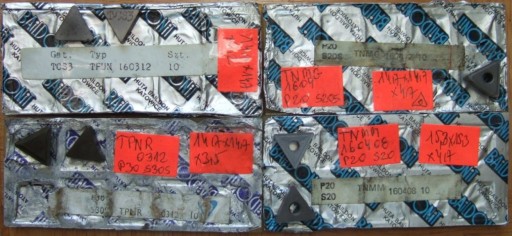 Płytki Płytka wieloostrzowe do noży tokarskich - głowic firmy Baildonit itp. Trójkątne z dziurką: TNMM 160408 P20 S20 (15,3x15,3x4,7) cena 14. --- TNMM 160408 S10S cena 16. --- TNMM 160412 S10S P10 cena 16.