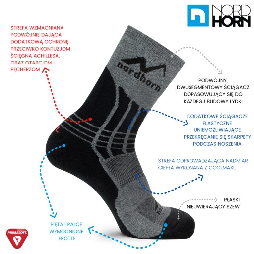 Przeznaczone dla miłośników pieszych wędrówek ekstremalnie ciepłe skarpety NH4P Primaloft® doskonale dopasowują się do kształtu każdej stopy. Podwójny górny ściągacz nie pozwala na opadanie skarpety, a dodatkowe ściągacze na śródstopiu zapobiegają skręcaniu i przemieszczaniu się jej w bucie. Wprowadzenie dodatkowo wzmocnionych stref w okolicy palców i pięty gwarantuje odpowiednią ochronę podczas aktywności.