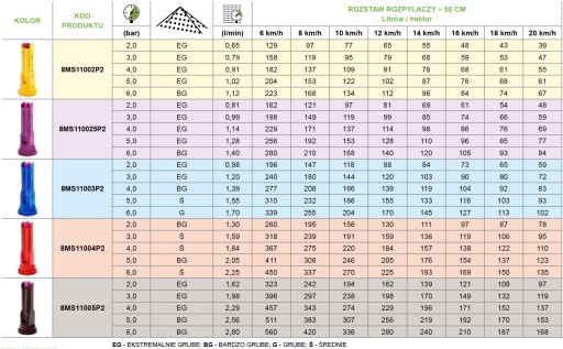 Natężenie przepływu 1,19 l/min przy ciśnieniu 3bar. Dysza przeciwwiatrowa, eżektorowa. Wytwarza krople grube i bardzo grube o dużej odporności na znoszenie przez co pozwala na wykonanie zabiegu przy wietrze do 8m/s.