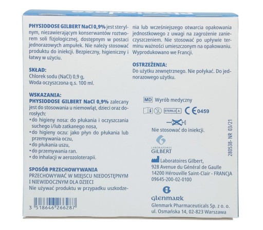 GILBERT NaCl 0,9% jest sterylnym, nie zawierającym konserwantów roztworem soli fizjologicznej dostępnym